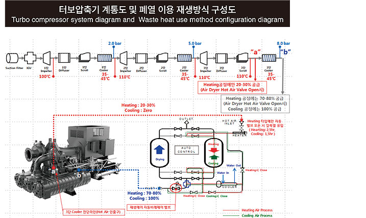 It is an adsorbent regeneration method using waste heat(100¡É) of a turbo compressor that can energy saving by more than 70% by filling it with a low-temperature regenerative adsorbent. It is the most economical air dryer with a medium and large capacity drying device.